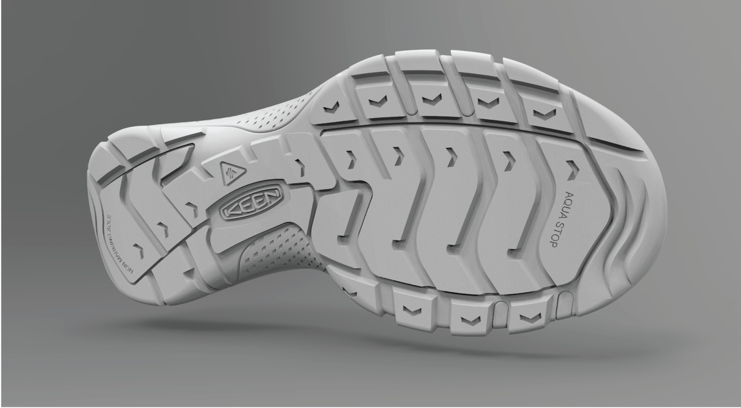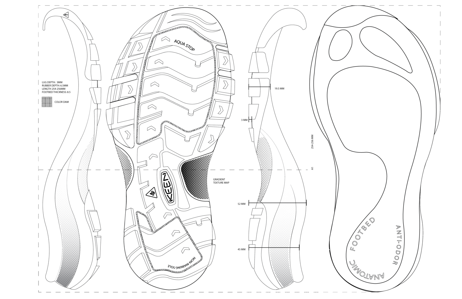 The new tread design features forefoot AQUASTOP siping and traction lugs. The contoured design along the sidewall and arch reduce rubber and overall weight. This tooling was created using 2 part molding, it features EVA injected midsole and a rubber outsole.