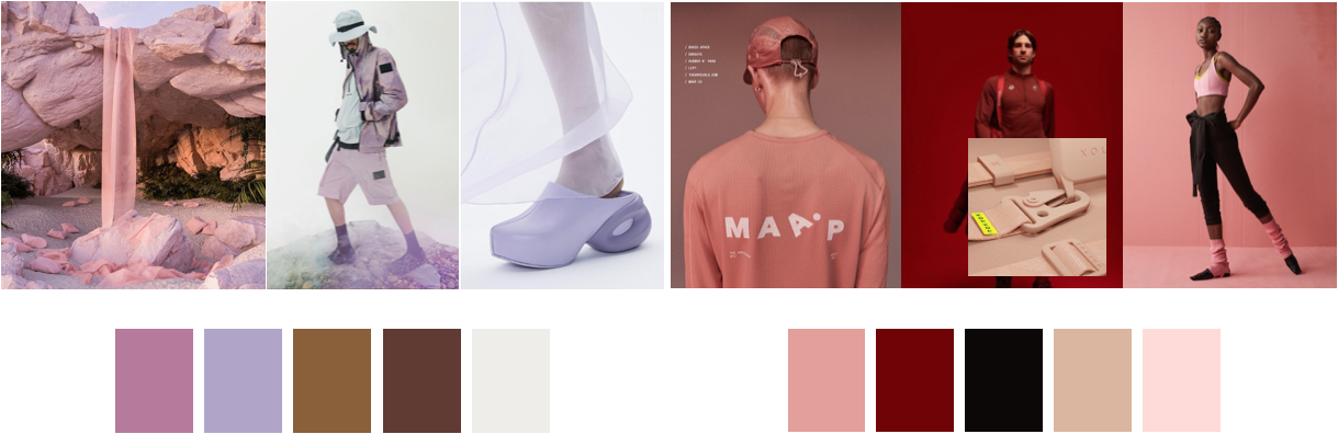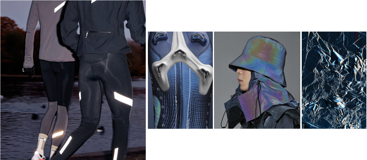 Night vision drives performance product to more extreme ranges. Desaturated warm neutrals like griege and brown are paired with reflective hits and sporty neons. Slick waterproofing materials with iridescent finish define this trend.